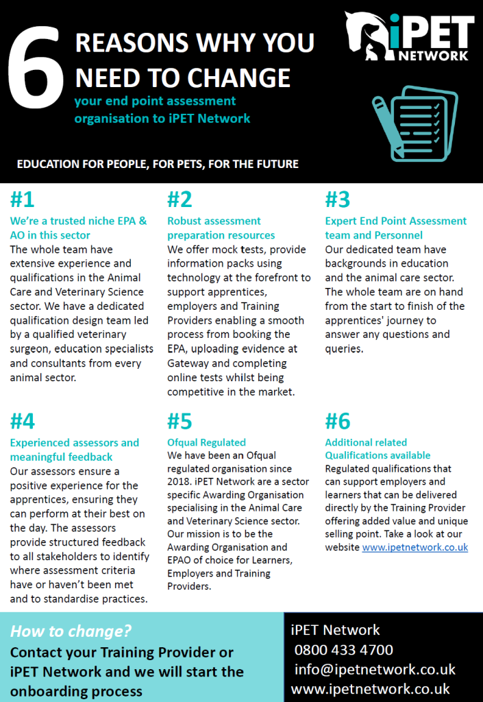 If you’re ready to become part of a trusted, regulated, and passionate Awarding Organisation that’s shaping the future of animal-care and Veterinary science education, contact Sarah Mackay (Director) on 0800 433 4700 or email epao@ipetnetwork.co.uk to find out more.