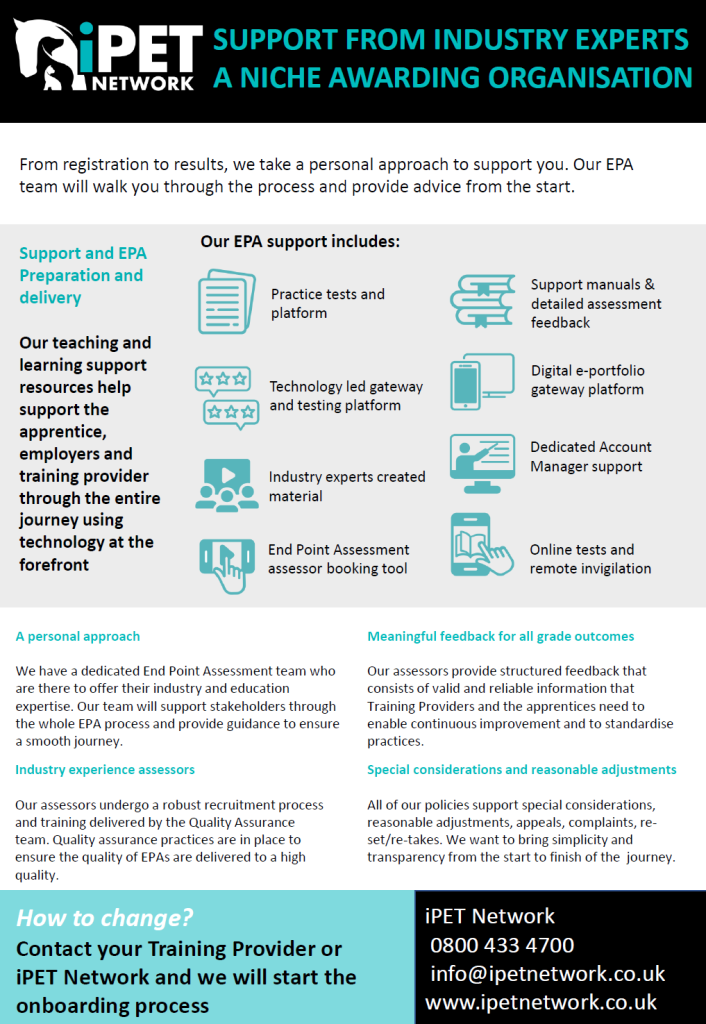 For further details on apprenticeship standards and national policy, visit the Skills England website. To discuss costings or arrange your End-Point Assessment with iPET Network, please contact our EPAO team at epao@ipetnetwork.co.uk
